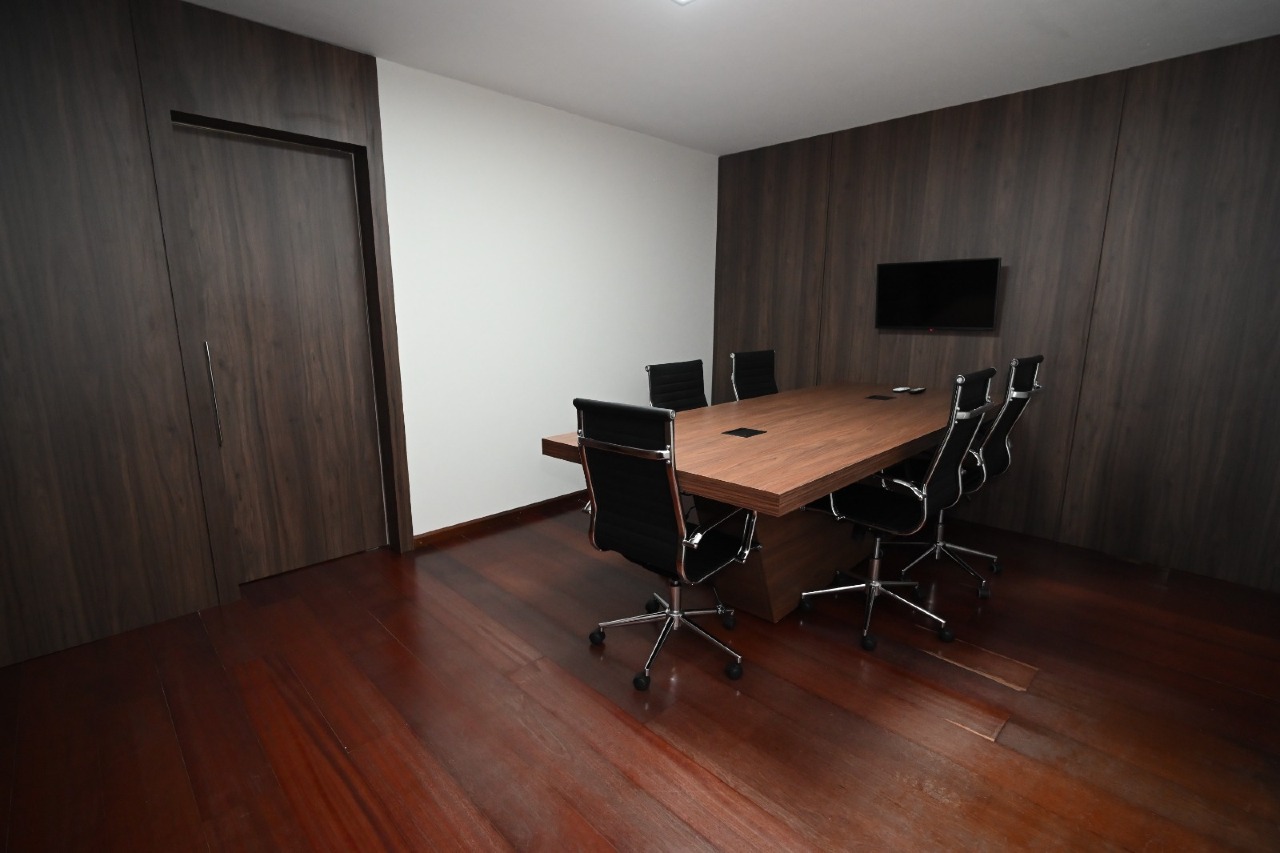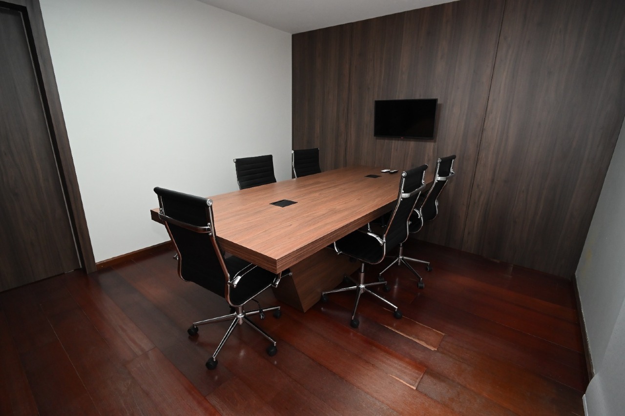 * Sala de Reunião Exclusiva: Ambiente sóbrio e sofisticado, com piso amadeirado,