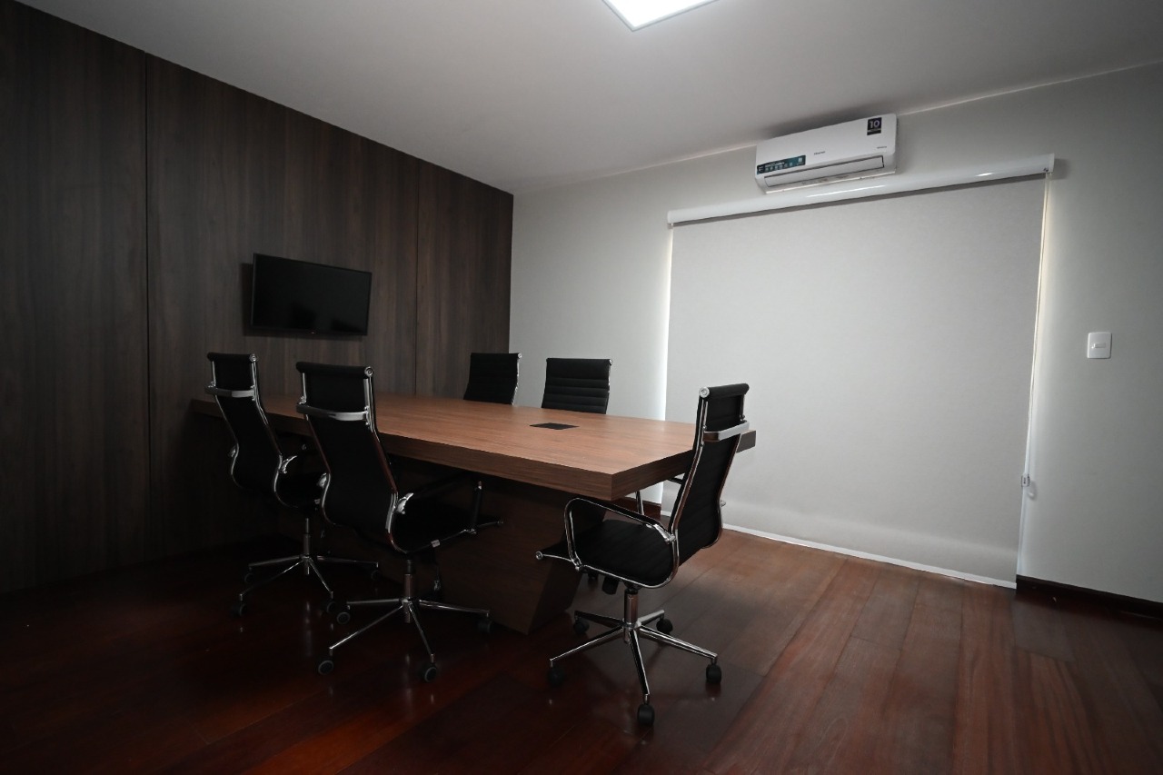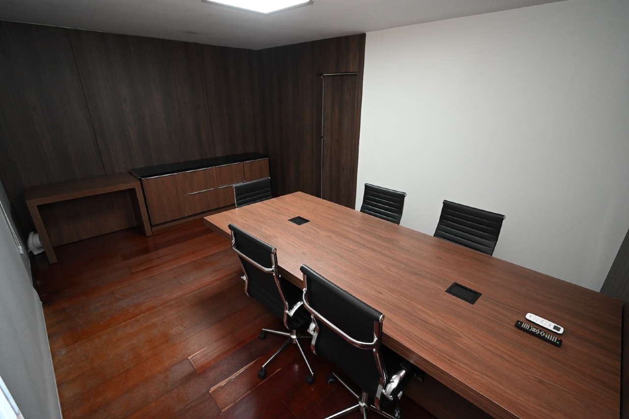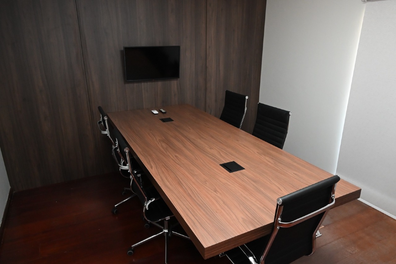 mesa de grande porte e infraestrutura para apresentações e videoconferências.